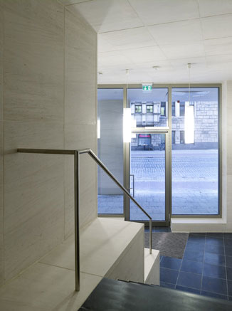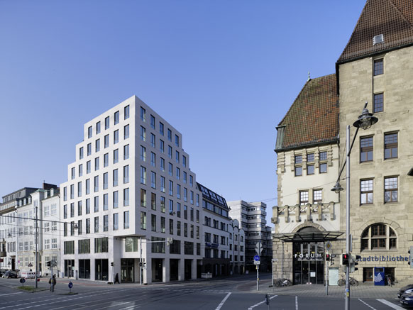 Die 8-geschossige Bebauung schließt eine der letzten Baulücken in der geschlossenen Bebauung entlang der historischen Wallanlagen, die seit dem Ende des Weltkriegs durch einen Flachbau nur teilweise besetzt war. Der Baukörper bildet ein Pendant zum gegenüberliegenden historistischen Polizeihaus und vervollständigt die Torsituation am Eingang zur Bremer Innenstadt. Die Fassade ist durch die stehenden Fensterformate klassisch vertikal strukturiert. Das 1. Obergeschoss ist mit seinen querformatigen Fenstern als Mezzaningeschoss deutlich herausgearbeitet. Die oberen Geschosse sind im Sinne einer moderaten Höhenentwicklung gegenüber der Bauflucht leicht zurückgestaffelt. Mit der Fassadenverkleidung aus hellem Kalkstein wird das Gebäude dem repräsentativen Anspruch des Bauplatzes gerecht.