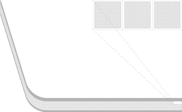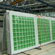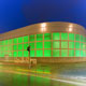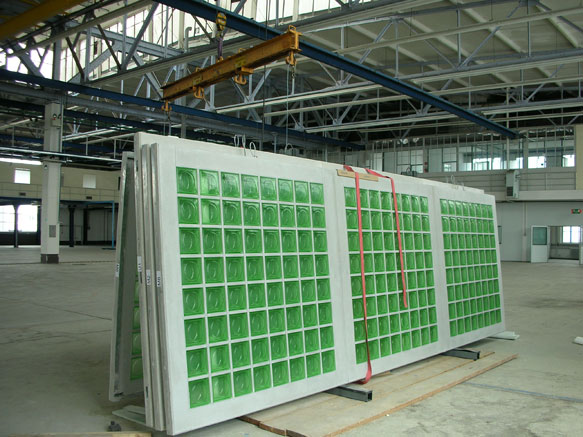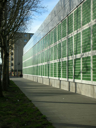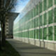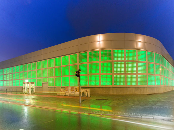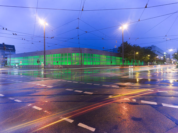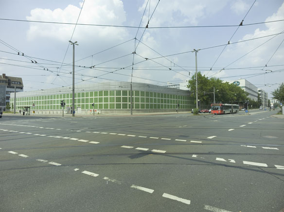 Entwicklung einer Fassade für ein Logistikzentrum in innerstädtischer Lage. Der Fassadenentwurf musste einerseits den gestalterischen Ansprüchen einer innerstädtischen Bebauung gerecht zu werden, andererseits die betrieblichen Anforderungen an Schallschutz und sommerlichen Wärmeschutz erfüllen. Realisiert wurde eine 2-schalige Fassadenkonstruktion mit belüftetem Zwischenraum, deren äußere Ebene aus grün eingefärbten Glasbaustein-Fertigteilen besteht. Die innere Ebene wurde als einfache Kassettenwand mit Trapezblech-Bekleidung erstellt.