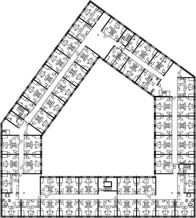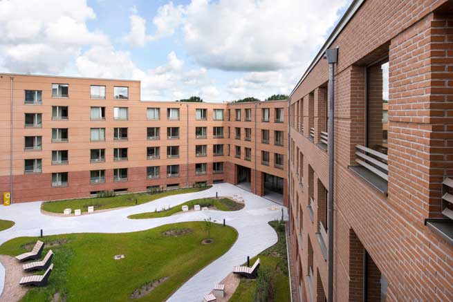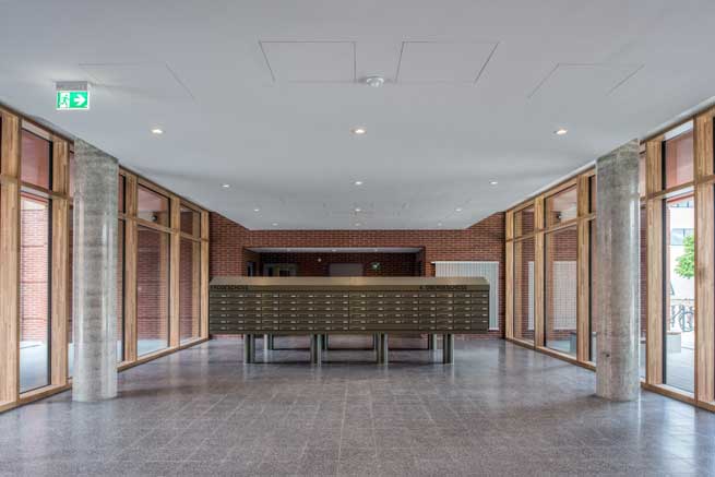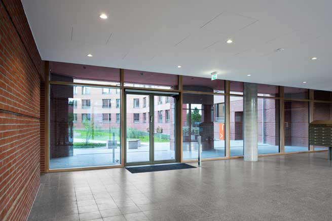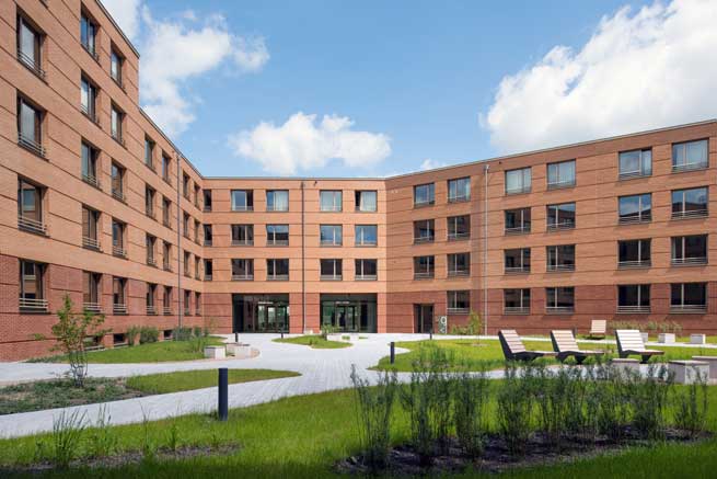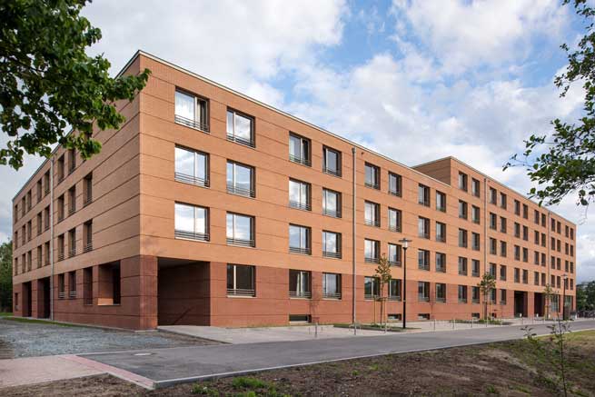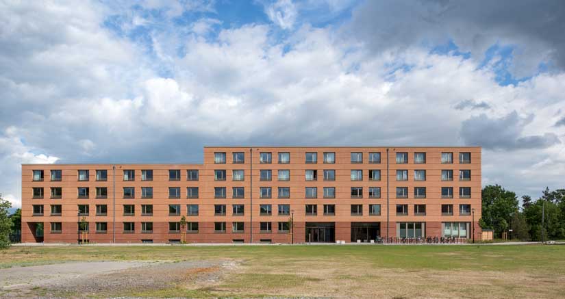 Der Neubau für studentisches Wohnen ist als polygonförmige 4-geschossige Blockrandbebauung für 380 Bewohnerplätze konzipiert. Er bildet den östlichen Abschluss des Universitätscampus. Ein transparentes Foyer mit angeschlossenem Haupttreppenhaus bildet die Adresse. Über den Innenhof werden die Eingänge zu den einzelnen Gebäudeabschnitten erschlossen. Ein großzügiger Kommunikationsraum befindet sich im Erdgeschoss und ist vom Innenhof aus zugänglich. Der geschlossene Innenhof vermittelt ein Gefühl der Identität und Geborgenheit. Die orangefarbene Klinkerfassade mit rotem Sockel folgt dem übergeordneten Gestaltungskonzept des Universitätscampus.
