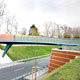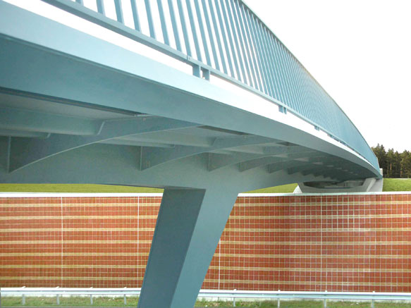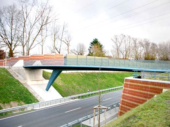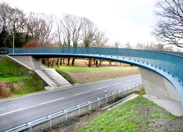 Planung von zwei Geh- und Radwegbrücken im Verlauf der Verlängerung der Bundesstraße B74 durch Bremen-Blumenthal. Die Straße verläuft durch den Ortsteil Rönnebeck mit teilweise sehr altem Baumbestand am Rande des Naturschutzgebiets Eispohl-Sandwehen. Die beiden Brücken sind als Stahlbrücken konzipiert, wobei die harmonisch geschwungene Wegeführung sowie die Ablesbarkeit der Kräfteverläufe die Dynamik der Form bestimmen. Mittels einer aus der Logik der Konstruktion abgeleiteten Gestaltung gelingt die Einbindung in die umgestaltete Landschaft und die gegebene Topographie.