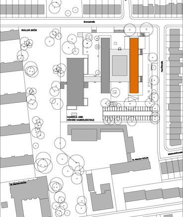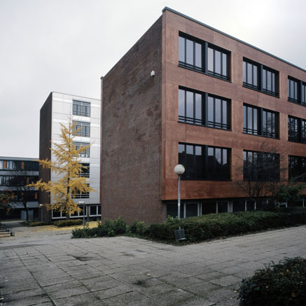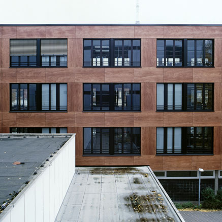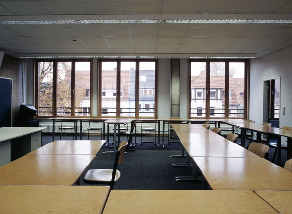 Der Gebäudeteil an der Hauffstraße erhält eine vollständig neue Fassade auf der Ost- und Westseite. Die alte Vorhang-Fassade aus den 1960er Jahren wurde demontiert. Hier heraus ergab sich die Chance die Klassenräume von zwei Seiten gleichberechtigt natürlich zu belichten und so einen hellen und lichten Raumeindruck zu erlangen.