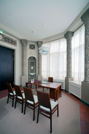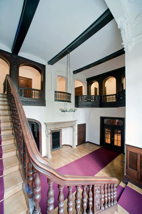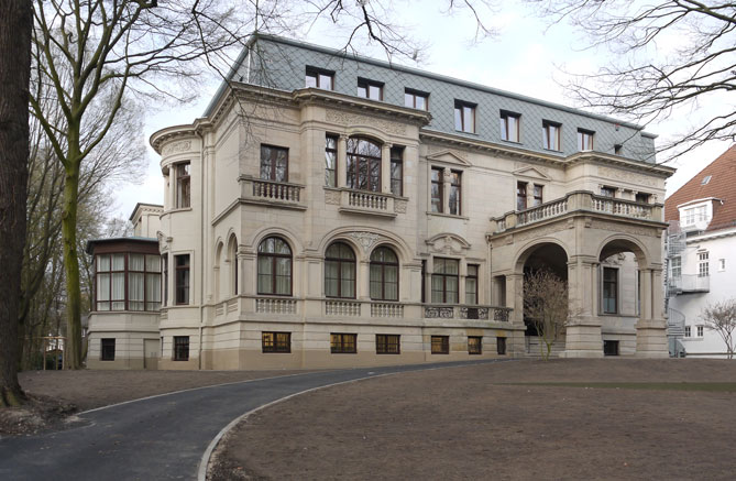 Die Halle und der große Wartesaal mit ihren opulenten Kaminen, dunklen Holzvertäfelungen mit geschnitzten Schmuckelementen, sowie dem Eichenparkett und einer vornehm zurückhaltenden Möblierung vermögen noch einen Eindruck zu vermitteln vom Prunk damaliger großbürgerlicher Wohnkultur der Jahrhundertwende.